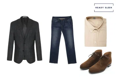 Items: Black Blazer, Dark Blue Or Dark Grey Jeans, Beige Broadcloth Shirt, Brown Suede Chukka Boots