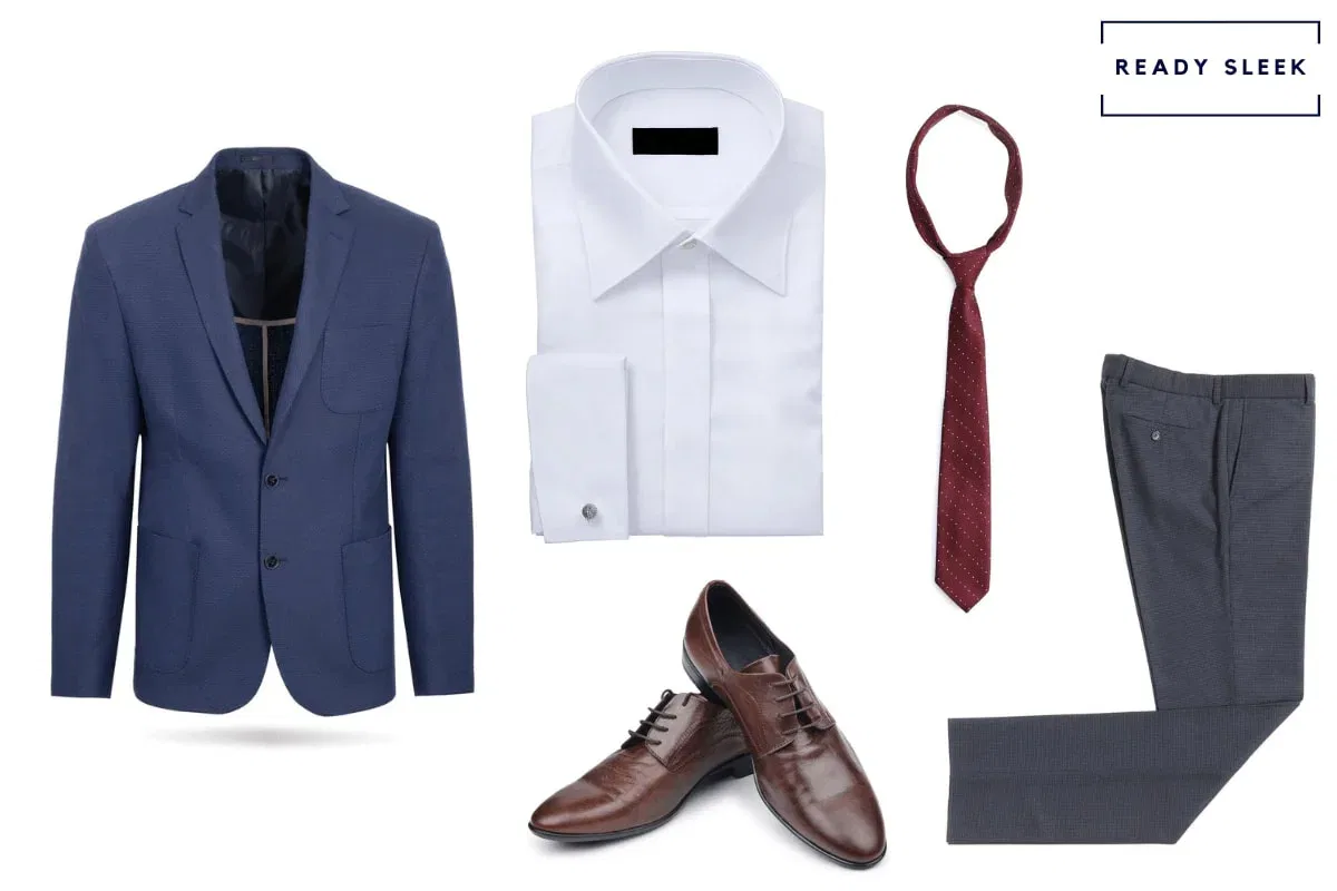 Items – Navy Blue Blazer, Charcoal Dress Pants, White Dress Shirt, Burgundy Necktie, Dark Brown Derby Shoes