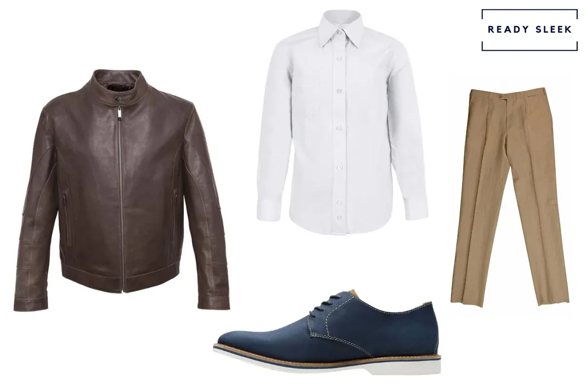 Items – White Chambray Shirt, Caramel Brown Dress Pants, Navy Suede Derby Shoes, Dark Brown Leather Jacket