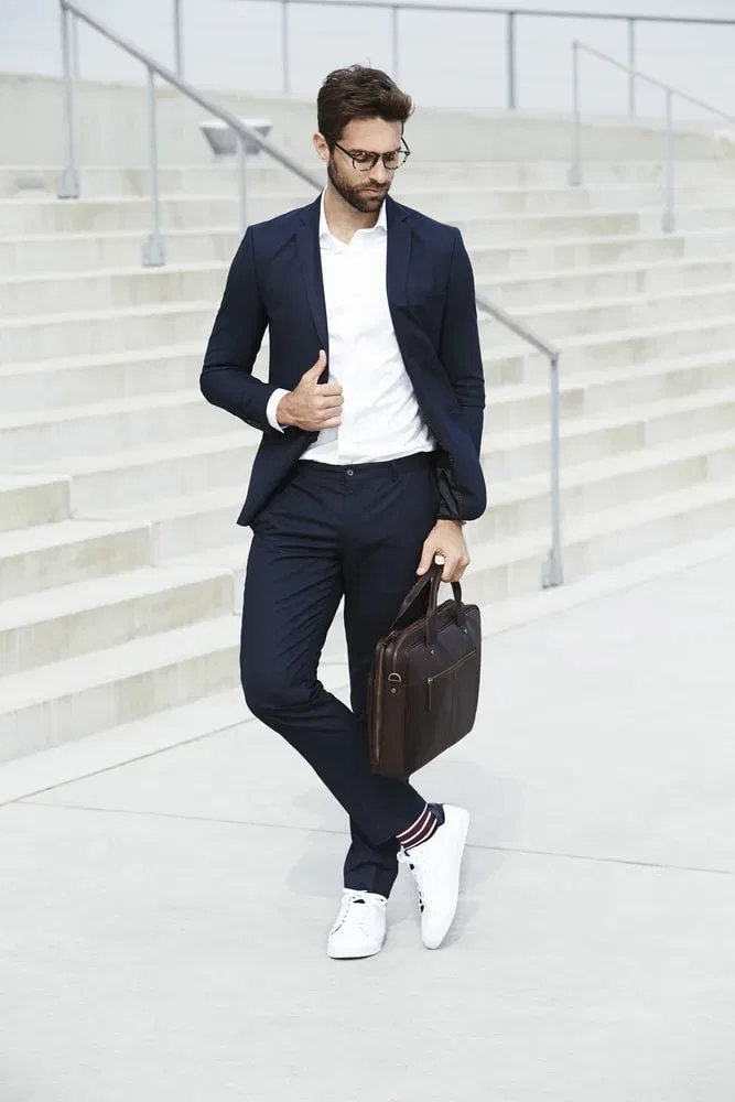 On the other hand, a sleek, white or grey pair of sneakers with minimal branding may actually go well with an especially casual suit.