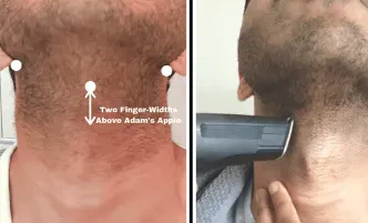 Remember, the neckline should look natural. Leave it at two-finger widths above your Adam’s apple, roughly following the angle of the jaw to either side. It should consist of goatee hair in the middle and stubble hair to either side.