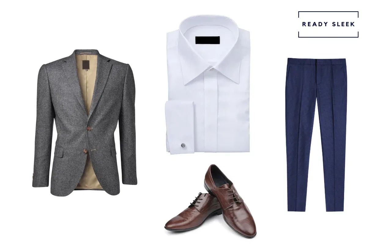 Items – Dark Grey Blazer, Navy Dress Pants, White Dress Shirt, White Or Blue Pocket Square, Dark Brown Derby Shoes