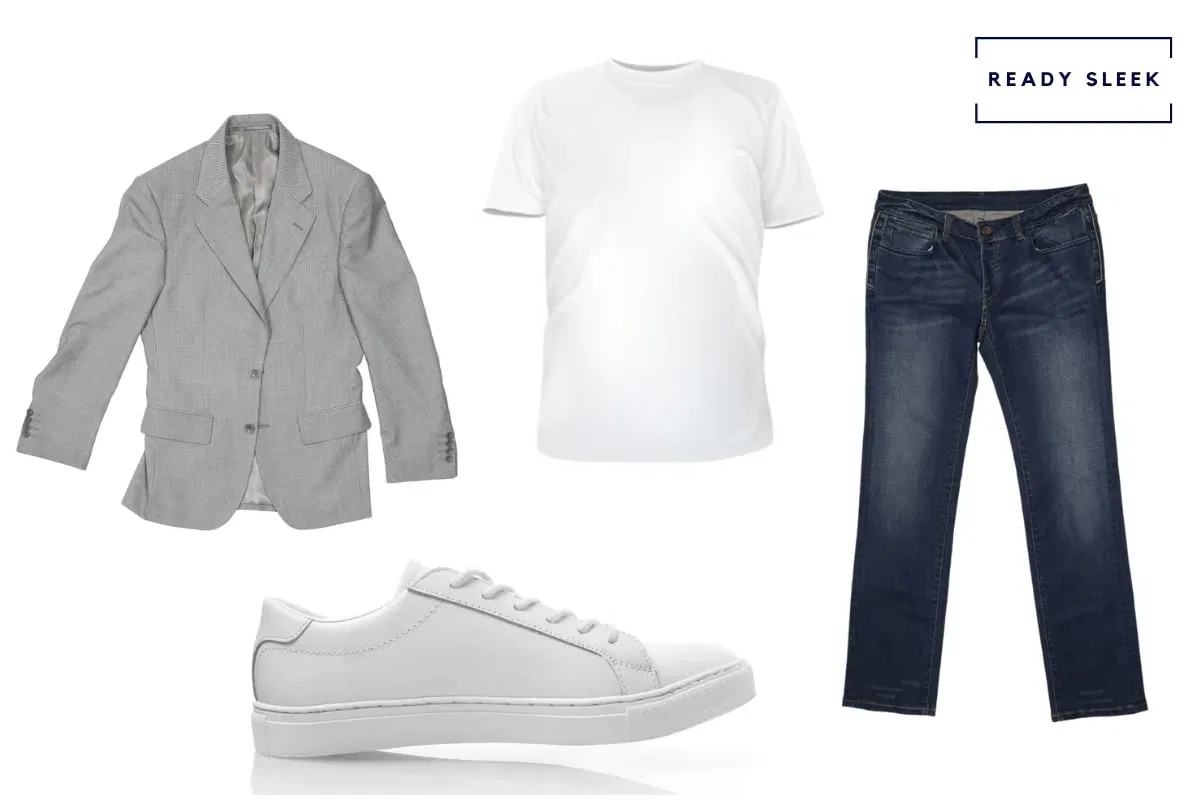 Items – Light Grey Blazer, Navy Blue Jeans, White T-Shirt, White Sneakers
