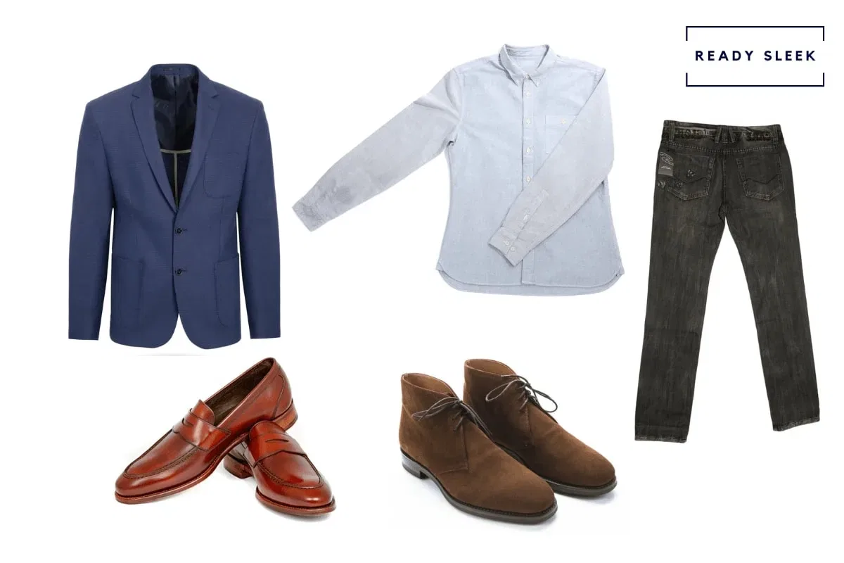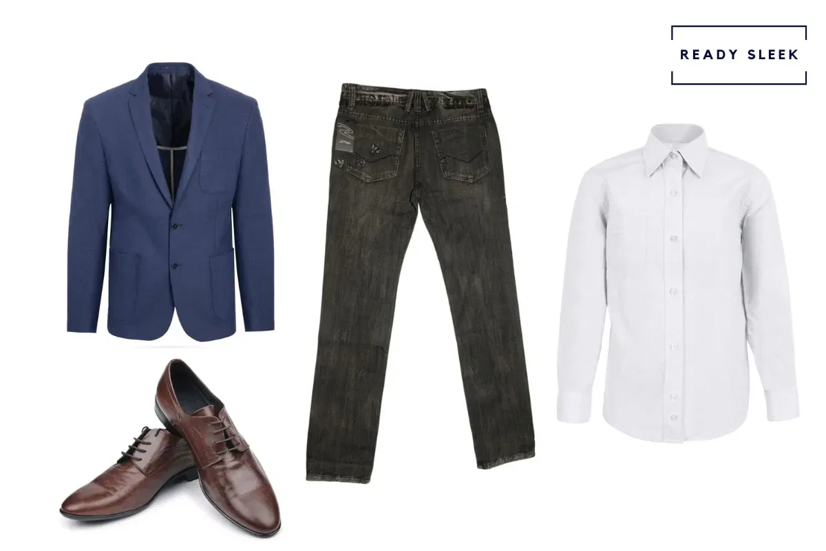 Items: Navy Blazer, Black Jeans, White Dress Shirt, Dark Brown Derby Shoes, White Or Light Grey Pocket Square