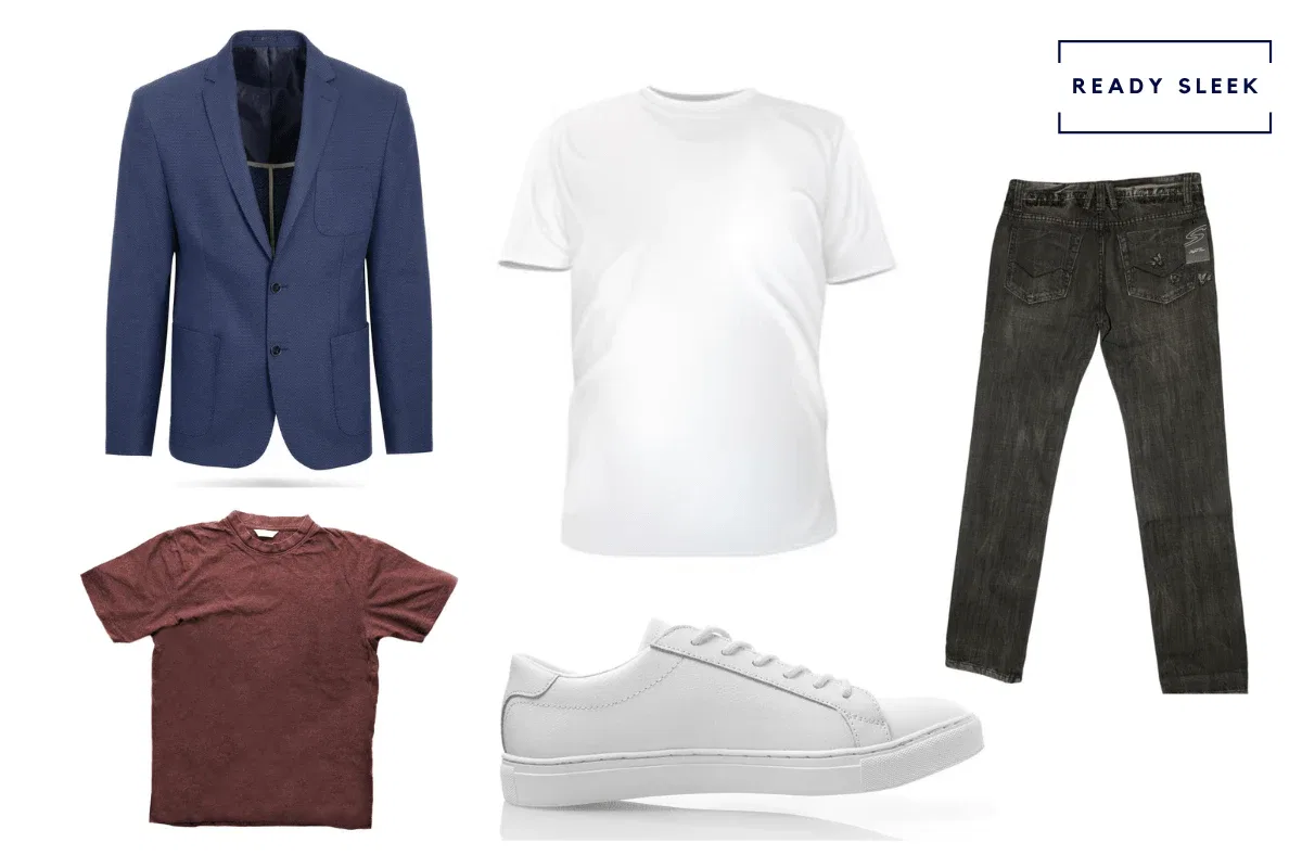 Items: Navy Blazer, Black Jeans, T-Shirt Or Henley, White Sneakers