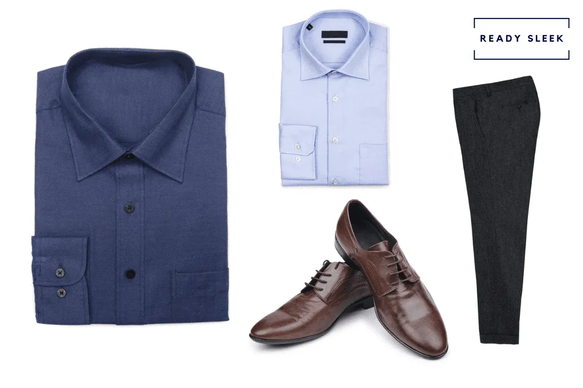 - Smart-Casual – Light/dark blue shirt with light/dark grey pants, light/dark brown shoes
