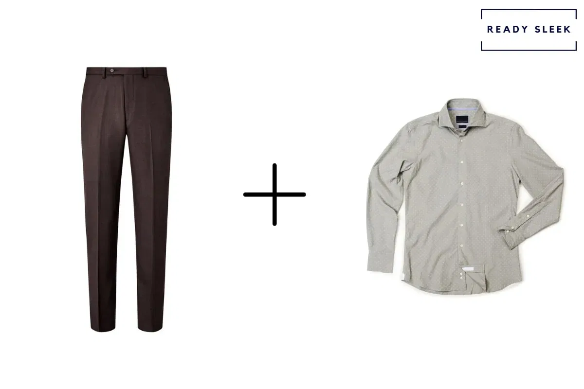 Dark brown pants can be worn with a green shirt in smart-casual settings, with the combination working especially well in the fall and winter.